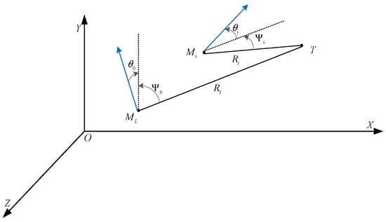 The relative motion relationship of the leader-follower missiles can be seen form Figure 2. Considering that Missles Leader (ML) is the leader missile, Mi is the ith follower missile, and T is the target, the velocity of the leader missile is , the trajectory inclination angle and the trajectory deflection angle are and , respectively; the vertical and azimuth LOS angle are and , respectively; the velocity of the ith follower missile is ; the trajectory inclination angle and the trajectory deflection angle are and , respectively; and the vertical and azimuth LOS angles are and , respectively.
