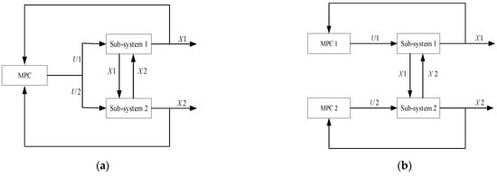 The application of the MPC method in a multi-agent cluster system has three structures: centralized, decentralized, and distributed MPC. As shown in Figure 4, the centralized MPC considers the overall performance of the cluster as an optimization index. In each sampling period, a central model predictor performs the rolling optimization on the overall control performance index of the cluster system to obtain the control sequence set with the best overall performance of the cluster system. Each sub-system of the decentralized and distributed MPC has an independent model predictor, which reduces the dimensionality of the system. It also reduces the amount of calculation for the online optimization of each sub-controller and increases the reliability of the system. The difference between the distributed and decentralized MPC is that there is no information interaction between the sub-controllers of the decentralized MPC. As a result, it cannot control the problem of the multi-agent system with coupling between the sub-systems.