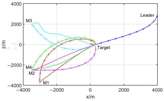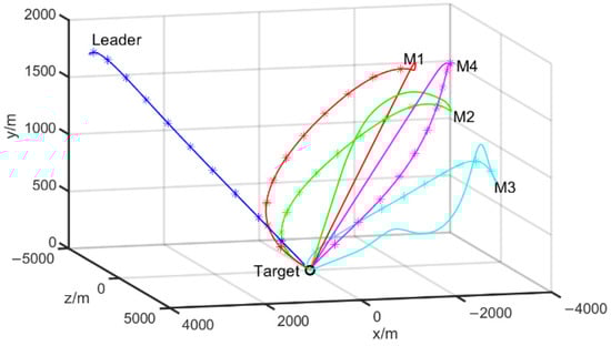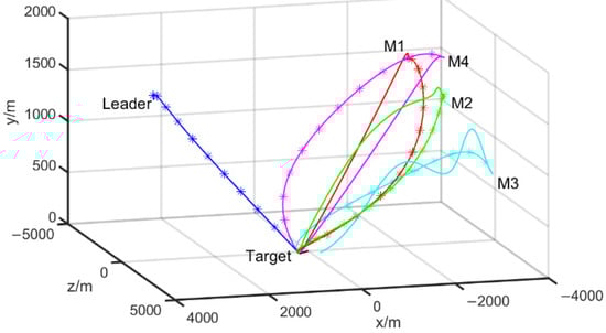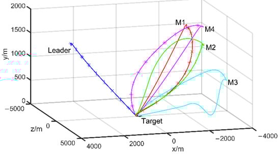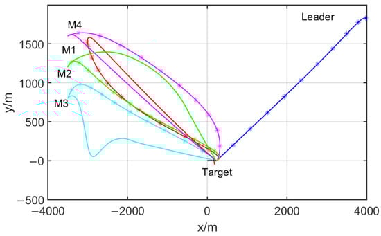 Let M1, M2, M3, and M4 denote four missiles participating in cooperative operations. The target is in the horizontal plane, and its initial position is at the origin of the coordinates. Table 1 lists the initial parameters of the proposed virtual leader missile (denoted as M) and follower missiles.
