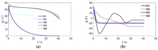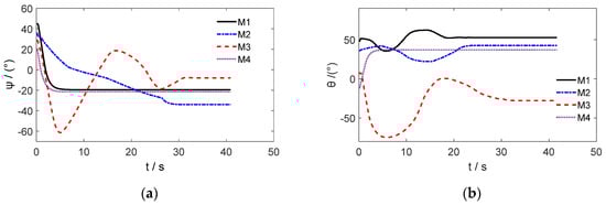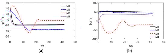 Velocity-inclination change curve of each follower missile during the cooperative attack on target 1 based on the MPC method: (a) Trajectory deflection curve; (b) Trajectory inclination curve.
