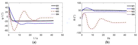 By tracking the distance between the missile and the target, each follower missile achieved a cooperative impact time with the virtual leader missile. When hitting target 1, target 2, and target 3, the cooperative impact time of the four missiles was the same as the impact time of the virtual lead missile, which was 41.66 s, 41.28 s, and 41.82 s, respectively. However, the impact angle did not meet the requirements at this time, and the iterative optimization of the guidance instructions through the MPC algorithm achieved the impact angle constraints at the terminal. In the simulation example, the impact angle constrained by each follower missile and the terminal impact angle are given by Figure 12, Figure 13 and Figure 14, when different guidance methods were used to attack an unfixed target.