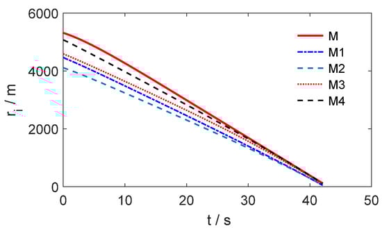 Figure 12, Figure 13 and Figure 14 show the changing curves of the impact angle when attacking a stationary target, a uniformly moving target, and a maneuvering target by the MPC method. Using the MPC method can not only realize the cooperative time but can also satisfy the impact angle constraints. Both the time cooperative guidance and the MPC-based guidance can make four missiles hit the target at the same time, but the former could only constrain the impact time of four missiles, while the latter achieved a multi-directional cooperative attack with designated angles on the target. This verified the superior guidance performance of the MPC-based 3D cooperative guidance law with multiple constraints. Figure 15 shows the tracking curve of the missile-target distance in the time cooperative strategy with the designed parameters. Figure 16 shows the curve of the remaining time error with the time obtained by the MPC method. Tracking the missile-target distance of the leader missile achieves a cooperative impact time between the follower missiles and the leader missile, but it does not meet the impact angle constraints. Therefore, the MPC method was used to iteratively optimize the control commands to meet the impact angle constraints.
