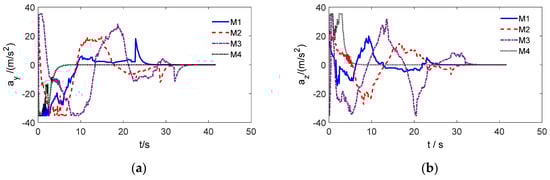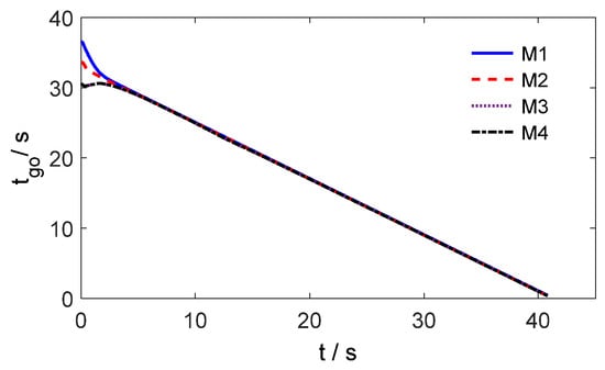 In the adjustable range, in order to enhance the ability of attack and damage on moving targets in a horizontal plane, the ideal impact angles of M1, M2, M3, and M4 are designated as , , , and , respectively. The ideal impact time is determined based on the flight time of the leader missile attacking different targets. The simulation results of cooperative attack by missiles on targets 1, 2, and 3 are shown in Figure 7, Figure 8, Figure 9, Figure 10 and Figure 11.