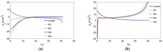 The control coefficients of the augmented proportional guidance method adopted by the five missiles are , ; the parameters are , ; the bandwidth of the fast dynamics sub-system is ; and the overload limit of the missile is 8 g. The impact time during the attack on a fixed target is shown in Table 3. According to the above design strategy, under the premise of adopting the augmented proportional guidance method, the impact time of the leader missile is greater than that of each follower missile. Therefore, the use of this scheme can provide a sufficient flight time adjustment margin for the follower missiles.