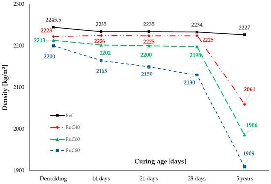 It can be observed that even though all specimens were kept in the same conditions, the reference kept its value for the density as compared to 28 days. The change from 28 days to 5 years was less than 1%. On the other hand, all three mixes of RuC exhibited a much larger decrease in the density by as much as 12% for RuC80. A possible explanation could be that, even though the same water/cement ratio was used for all mixes, due to the hydrophobic nature of rubber particles, the excess water available for the hydration of the cement paste evaporated due to the storage conditions. Since the amount of cement was the same for all mixes (Table 1) and the curing and storing conditions were identical, it was thought that the rate of hydration was similar for all mixes, and therefore the excess water was lost by evaporation.