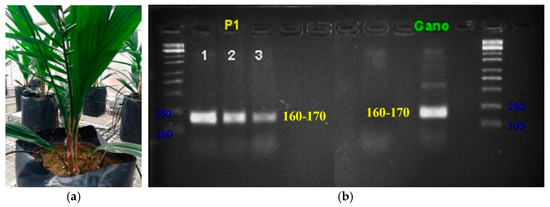 Sample of an infected seedling. (a) Condition of an infected seedling without symptoms i.e., no fruiting bodies and yellowing of older leaves. However, the disease is confirmed by the (b) PCR amplification using specific primer of G. boninense.