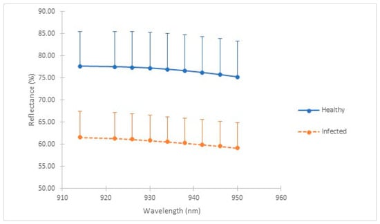 Graph of reflectance (%) for each wavelength (nm) for healthy and infected seedlings.