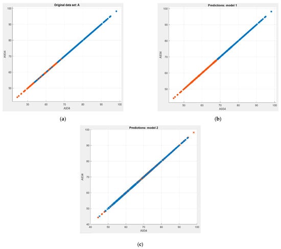 Scatter plot of SVM classification models. (a) Original dataset before classified using (b) linear SVM and (c) cubic SVM.