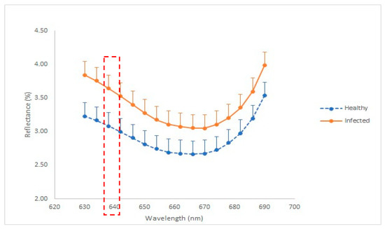 As shown in Figure 4, the highest separation gap of the average reflectance between healthy and infected plants for the red region was obtained at wavelength number 630 nm with 0.61%. For NIR region, wavelength number 934 nm was selected to be used to develop the NDVI since it was identified as the band with the highest separation gap of average reflectance value between healthy and infected seedlings.