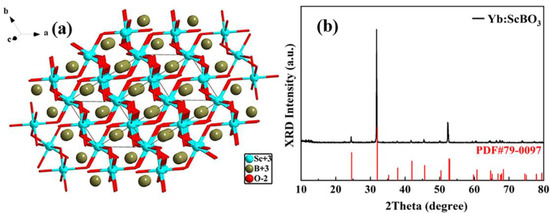 (a) Structural diagram of ScBO3 and (b) comparison between X-ray powder diffraction pattern of standard PDF#79-0097 and Yb3+:ScBO3 crystal [34].