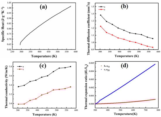 when the temperature increased at above temperatures range, the a-axis thermal conductivity increased from 3.61 W·m−1·K−1 to 3.86 W·m−1·k−1, and the c-axis thermal conductivity also increased from 2.98 W·m−1·K−1 to 3.36 W·m−1·K−1 (as presented in Figure 3c). Owing to the tendency of the thermal conductivity to rise with rising temperature, this crystal can be utilized in generating medium lasers.