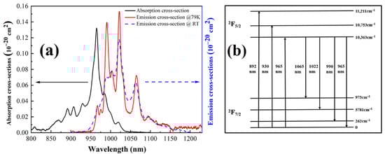 (a) Emission cross-section spectra (RT and 79K) and absorption cross-section (RT) spectra; (b) diagram of energy level. (Source: [34], © 2015 Optica Publishing Group, Washington, DC, USA).
