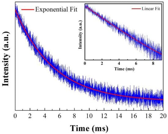 RT fluorescence lifetime fitted by exponential functions. Inset: the linear fitted lifetime with log (intensity) vs. time. (Source: [34], © 2015 Optica Publishing Group, Washington, DC, USA).
