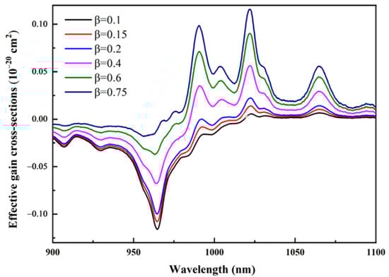 The positive part of σg is presented in Figure 6 as different values of β. When = 0.75, the positive extent, which resembles Yb3+:YAG (950–1080 nm) [50], Yb3+:CYB (960–1100 nm), and Yb3+:CaGB (960–1100 nm), was 970–1100 nm [47,51]. The excellent characteristics of these crystal are suitable for tunable and femtosecond lasers. When β = 0.75, Yb3+:ScBO3 could, in theory, back a pulse continuation of 65 fs. The correlation between the gain bandwidth (Δν) and the shortest pulse duration (tFWHM) was used to determine the pulse continuation [52]: