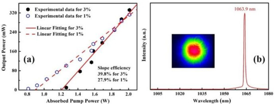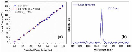 A CW laser has been demonstrated and the corresponding laser performance is exhibited in Figure 8. It indicates that the threshold was 2.38 W. Under a 4.9-W pump power, the output power rose to 167 mW, and the slope efficiency was 9% at a wavelength of 1.063 μm. The light-to-light conversion efficiencies, calculated from the data above, are 4% and 9%, respectively. The laser performance can be greatly enhanced by utilizing a higher transmission of the output couplers, mode matching, coating conditions, etc.