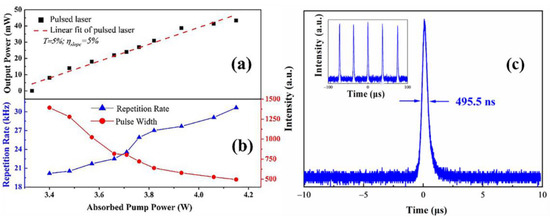 (a) Pump power versus average pulsed output power, (b) pump power as a function of repetition frequency and pulse width, respectively, and (c) single pulse. Inset: pulsed train [33].