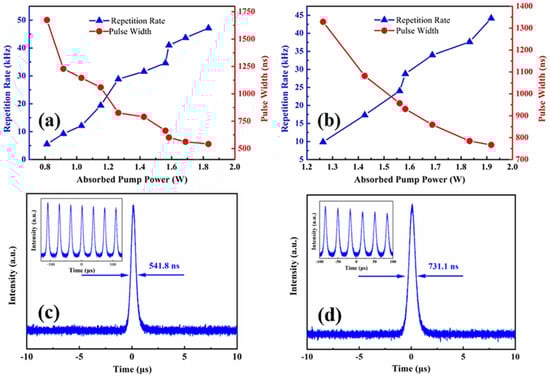 As shown in Figure 11a,b, because the absorption pump power increased, the repetition frequency and the pulse width curves flattened. For the 1% and 3% output couplers, the shortest pulse widths were 541.8 ns and 731.1 ns, and the maximal repetition frequencies were 46.1 kHz and 38.8 kHz, respectively. The single pulses with minimum pulse widths, mentioned earlier, are shown in Figure 11c,d, and the relevant pulse trains are shown in the insets. The pulse energy can be calculated from the values of the output power and the repetition frequency. If combined with the pulse width, the peak power can also be obtained. When using the 1% output coupler, the maximal peak power was 9.8 W and the maximal pulse energy was determined to be 5.3 μJ. The maximal peak power was 10.2 W, and the maximal pulse energy was 7.3 μJ as using the 3% transmittance output coupler.