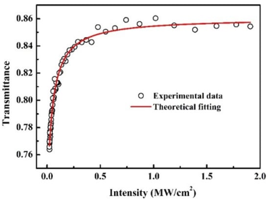 The nonlinear optical characteristics of the Yb3+:ScBO3 crystal were determined using a Z-scan test. Figure 12 shows the transmittance versus input energy intensity of the crystal when the Yb3+:ScBO3 crystal was at a wavelength of 1064 nm. The data were fitted utilizing the equation below [58]: