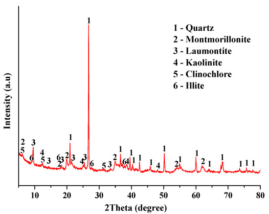 The X′PertPRO X-ray diffractometer produced by PANalytical B.V. in the Netherlands was used to examine the mineral composition of the soil sample. The X-ray diffraction pattern is shown in Figure 2, and the mineral composition is shown in Table 3. Following Figure 2 and Table 3, the minerals in the red clay samples can be identified as quartz, laurel, montmorillonite (2:1 layered silicate), kaolinite, clinochlorite (2:1 phyllosilicate), and illite. In addition, the color of the soil sample also determines the existence of hematite; however, its content in some samples is possibly lower than the XRD limit of detection, so the XRD peak is not apparent (approximately 35 2theta). The semi-quantitative method chosen for minerals was the Rietveld method [21].