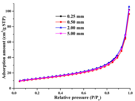The low-temperature nitrogen adsorption test (LT-NAT) measurement process is divided into two stages: adsorption and desorption. Take red clay with a particle size of 0.25 mm as an example. The adsorption amount of red clay during increasing and decreasing the relative pressure is illustrated in Figure 3. It is apparent that when the relative pressure is slight, the adsorption isotherm and the desorption isotherm coincide with each other. When the relative pressure is more extensive than 0.8 P/P0, the desorption isotherm is above the adsorption isotherm, indicating that red clay has a larger adsorption capacity during desorption than adsorption. The adsorption isotherms of red clay with different particle sizes are provided in Figure 4. These adsorption isotherms show a similar upward trend with the increase in relative pressure, and the curve is concave, indicating weak interaction. In addition, the adsorption isotherm can be divided into two stages: (1) Slow linear growth stage (when the relative pressure P/P0 is between 0 and 0.6, the adsorption isotherms of red clay with different particle diameters coincide with each other). (2) Rapid non-linear growth stage (when the relative pressure P/P0 is between 0.6 and 1.0, there is a slight difference between the adsorption isotherms of red clay with different particle sizes, and the adsorption quantity of red clay with a particle size of 0.5 mm is significantly lower than that with other particle sizes under the same relative pressure). Table 4 describes the SSA of red clay with different particle sizes, as calculated by Equations (2) and (3).
