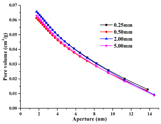 The pore size distribution principle is based on the capillary condensation phenomenon and the volume equivalent exchange rule [24]. The amount of liquid nitrogen permeated in the red clay particles is equal to the volume of the pores. Based on the Kelvin equation, the relationship between the partial pressure of adsorbate and the pore size of capillary condensation is described in Equation (4). The cumulative pore volume curves of BJH adsorption and desorption are given in Figure 5 and Figure 6, respectively, and the pore volume of red clay with different particle sizes is shown in Table 5.