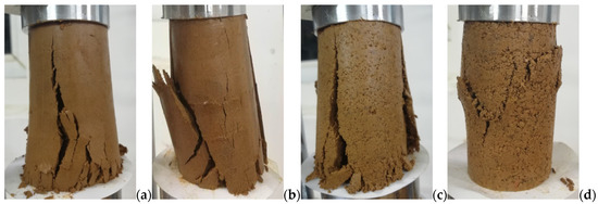 Take the red clay with a dry density of 1.4 g/cm3 as an example. The failure pattern of the soil samples after the UCS test is provided in Figure 7. The failure patterns of red clay samples with different particle sizes appear as split and shear failure after the UCS test. It is worth noting that when the particle size is 0.5 mm, although the soil sample shows apparent shear failure, there are also evident cracks on the surface of the soil sample and split failure on the other side. Furthermore, when the particle size is between 0.25 and 2 mm, the bottom of the sample fails first, and the damaged surface expands from the bottom upwards as the pressure increases until the sample is destroyed. The main reason is that the top of the unconfined compression instrument is fixed, and the pressure is loaded onto the soil sample when the bottom rises. When the soil particles are small, the internal structure of the soil sample is dense, and the pores are tiny. As the loading pressure increases, relative slippage between soil particles is arduous, causing the soil sample to split or undergo shear failure from the bottom first. When the particle size is 5 mm, as the pressure increases, no fracture cracks appear at the upper and lower ends of the soil sample; on the contrary, shear bands are generated in the middle, resulting in shear failure. The main reason is that when the soil particles are significant, there are many pores between them, which causes relative slippage. As the loading pressure grows, the pores gradually connect from point to line and then to the surface, forming a shear zone and causing shear failure in the soil sample.