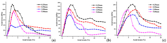 As shown in Figure 8, the UCS tests of red clay under different dry density conditions have obtained stress–strain curves of different particle diameters, which all reveal strain-softening with evident peak strength, and the peak point is on the left. As axial strain increases on the left side of the peak point, the axial stress increases rapidly. The soil mass is undergoing compaction, and the internal pores are gradually reduced. To the right side of the peak point, the axial stress rapidly drops and then slowly decreases. Comparing these with the curves of the red clay of different dry densities, as the dry density increases, the peak point gradually moves to the right along the horizontal axis, indicating that the soil mass has a more extraordinary ability to withstand deformation before failure with the increase in dry density.