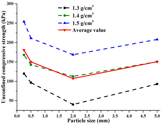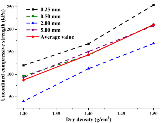 By defining the axial stress corresponding to the peak point of the stress–strain curve as the UCS of red clay, the curve of the relationship between the dry density and UCS of red clay with different particle sizes can be derived (Figure 9). The relationship between the particle size and the UCS of red clay at various dry densities is shown in Figure 10. According to these two figures, the greater the dry density, the greater the UCS of the red clay under different particle size conditions. Furthermore, as soil’s particle size increases, the red clay’s UCS first decreases and then increases under different dry density conditions. In Figure 9, at the same dry density, the UCS is most prominent at a particle size of 0.25 mm, smallest at a particle size of 2.0 mm, and closest at particle sizes of 0.5 mm, and 5 mm. The average UCS is 87.46 kPa for different particle sizes at a dry density of 1.3 g/cm3, increasing by 64.17% and 140.59% for dry densities of 1.4 g/cm3 and 1.5 g/cm3, respectively. In Figure 10, the average UCS for different dry densities is 107.22 kPa at a particle size of 2.0 mm, increasing by 68.53%, 40.03%, and 40.42% at particle sizes of 0.25 mm, 0.5 mm, and 5.0 mm, respectively. The UCS is mainly related to the failure mode of the soil mass. Videlicet, when the soil particle size is smaller than 2.0 mm, the soil mass undergoes split failure. The larger the particle size, the smaller the UCS of the red clay. However, when the particle size of the soil is relatively large, the soil undergoes shear failure, and the UCS is mainly related to the friction between the particles, enhancing the strength of the soil. Hence, with the growth in particle size, the failure pattern of the soil mass changes from split failure to shear failure.