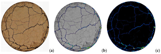 Red clay samples with different particle sizes and dry densities were subjected to 12 WD cycle tests, and three-dimensional crack extraction was performed on a ring knife sample of each. The fracture extraction process of the twelfth cycle of the soil sample with a dry density of 1.3 g/cm3 and particle size of 0.25 mm is illustrated in Figure 11.