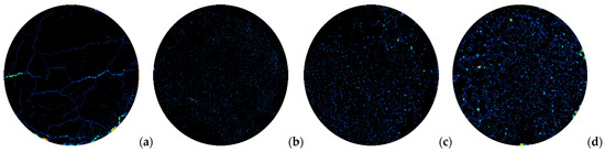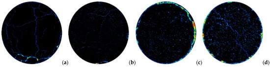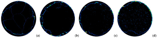 Cracks in soil sample after 4 WD cycles: (a) 0.25 mm; (b) 0.50 mm; (c) 2.00 mm; (d) 5.00 mm.