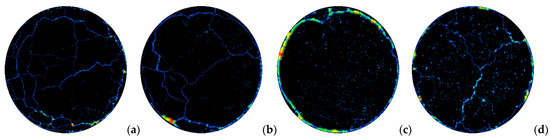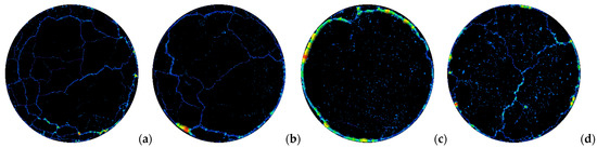 Cracks in soil sample after 8 WD cycles: (a) 0.25 mm; (b) 0.50 mm; (c) 2.00 mm; (d) 5.00 mm.