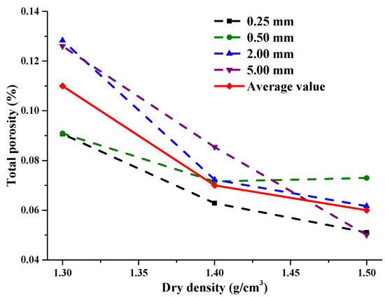 It can be seen from Figure 16, Figure 17 and Figure 18 that after 12 WD cycles, the soil samples with particle sizes of 0.25 mm and 0.50 mm and a dry density of 1.3 g/cm3 mainly presented cracks. As the dry density increased to 1.4 g/cm3 and 1.5 g/cm3, the number of cracks significantly declined. The soil sample with a particle size of 2.00 mm mainly presented cracks and independent pores caused by water loss and shrinkage, and the number of pores and cracks reduced with the increase in dry density. The soil sample with a diameter of 5.00 mm was mainly composed of cracks, pores, and edge cracks. When the dry density increased to 1.4 g/cm3, the cracks in the middle of the soil sample decreased, and the independent pores decreased when the dry density reached 1.5 g/cm3. With the same dry density, the larger the particle size of the red clay, the greater the number of independent pores, but the cracks in the soil sample with the smallest particle size of 0.25 mm were the most developed. After quantification, the dry density and total porosity curves were determined (Figure 19), as were the curves of dry density and fractal dimension (Figure 20).