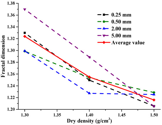 The dry density displays curves with the total porosity and fractal dimension, as shown in Figure 19 and Figure 20. In other words, the greater the dry density, the smaller the total porosity and fractal dimension of the red clay soil sample. In Figure 19, for a dry density of 1.3 g/cm3, the average total porosity of different particle sizes is 0.11%. Compared with this, when the dry density is 1.4 g/cm3 and 1.5 g/cm3, the average total porosity is reduced by 36.36% and 45.45%, respectively, with a difference of 14.29%. In Figure 20, for a dry density of 1.3 g/cm3, the average fractal dimension of different particle sizes is 1.324. In contrast, for the dry densities of 1.4 g/cm3 and 1.5 g/cm3, the average fractal dimensions are reduced by 5.21% and 8.16%, respectively, with a difference of 3.11%. The main reason is that the higher the dry density, the denser the soil sample, the smaller the internal pores, and the larger the force between the soil particles. As a result, the WD cycle and particle sizes have little effect. In addition, at different dry densities, the total porosity and fractal dimension of soil samples also vary with particle size.