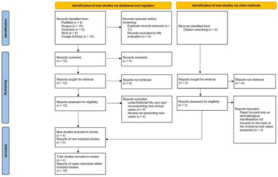 The selection process identified four pieces of research eligible for inclusion in the review: Michon A. (2021) [24]; McMahon et al. (2021) [25]; Munavalli et al. (2021) [26]; Munavalli et al. (2021) [27]. A total of 18 patients were evaluated. (Figure 2).