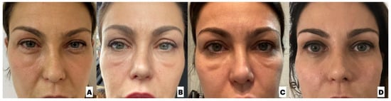 At the end of 2017 the patient received tear trough deformity treatment for the first time, using Juvederm Volbella (Allergan, Irvine, CA, USA). In October 2018, she developed bilateral lower eyelid edema (Figure 2B). A medical examination bilaterally revealed a swollen, mildly erythematous and tender tear trough area; the patient was prescribed an oral administration of betamethasone (1 mg per day for three days) and cetirizine dihydrochloride (10 mg per day for three days). Following the medical therapy, no improvement was recorded and the patient was admitted for hyaluronidase injections. Three sessions of hyaluronidase injections were performed (300 units per side, per session). The first and second sessions were spaced by three weeks (Figure 2C), the last one was performed forty days after the second (Figure 2D). Between the second and the third session, the patient also experienced bilateral conjunctivitis that self-resolved within five days.