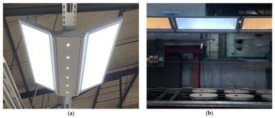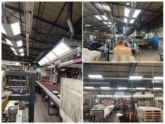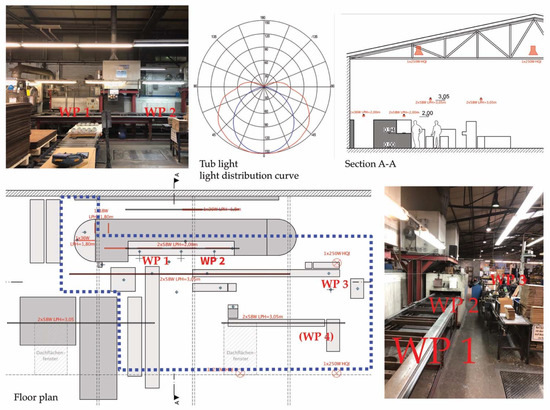 The project was realized on site in an industrial production facility belonging to RHI Magnesita AG, located in Marktredwitz, Germany. The relevant workspace is an open area of about 130 m2, called the finish line, inside a large industrial hangar. The workspace’s floor plan, sections, and pictures are shown in Figure 1. Except for a small number of ventilation skylights, there is no daylight available at the workspace (see below for a more quantitative evaluation of daylight availability). The finish line is the last production step for high-temperature oven components before shipping. Workers set the products on a conveyor belt that takes the components through an automated sanding process. The products must then be visually checked for cracks, flaking, and other imperfections. After quality control, the components are packaged in crates for shipping in a different area of the same workspace.
