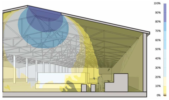 Figure 2 shows the simulation results for a vertical cut through the quality control workplace and the skylight. The false-color scale shows the daylight autonomy (see Appendix A) in percent for a 240 lx threshold during a time window of 8–11 a.m. The relevant point is at the eye level of the workplace, marked by the silhouetted figure, where there is about 1% daylight autonomy.
