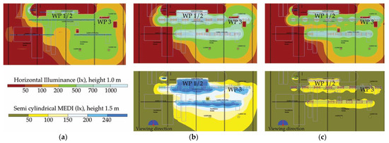Simulation results for the photopic and melanopic models. The top panels show a visualization of the lighting scenario. The use of color is purely qualitative. Middle panels show the photopic illuminance at task level (lx, 1.0 m height) in a false-color scale floor plan. The bottom panels show the scales and the MEDI (lx, 1.5 m height) in a false-color scale floor plan. (a) Stock lighting. An approximate lighting distribution was used for the tub lights. Fluorescent lamp specifications were according to the fitting found on site (mostly 2 × 58 W). (b) Morning scenario with a high melanopic setting. (c) Night-time scenario with a low melanopic setting.