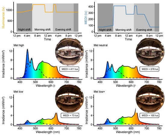 The visual lighting requirements were mostly met by the stock lighting system, as can be seen in Table 1. The comparatively high illuminance requirements in workplaces 1 and 2 led to quite high MEDI values at eye level. Both statements are the opposite at workplace 3 (and 4). In all cases, MEDI values are acceptable at some, albeit different, times of the 24 h day, but not others. This has the potential to further chronodisruption, as every time window brings the same melanopic stimulus. The static nature of the lighting had to change based on the time of day under a new circadian lighting regime. As melanopic stimuli, we set 240 lx MEDI or above during the morning hours and below 100 lx MEDI during the night. See further below, in the Discussion Section, for our rationale of these thresholds.