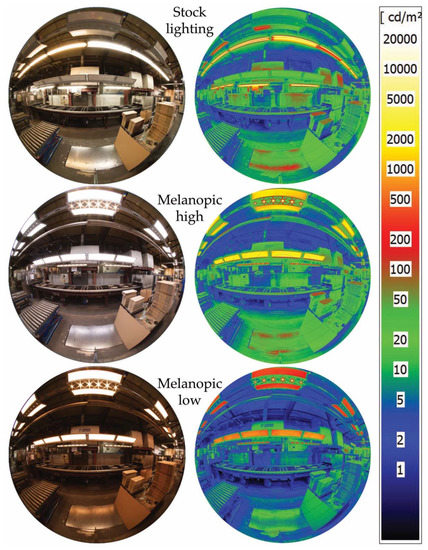 Figure 7 shows the luminance distribution of the high and low melanopic settings beside the stock lighting system as false-color scales alongside the 180° fisheye photographs.