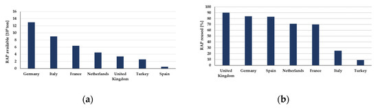 SITEB analysis on RAP in Europe: (a) RAP available in each country; (b) Percentage of reused RAP [50].