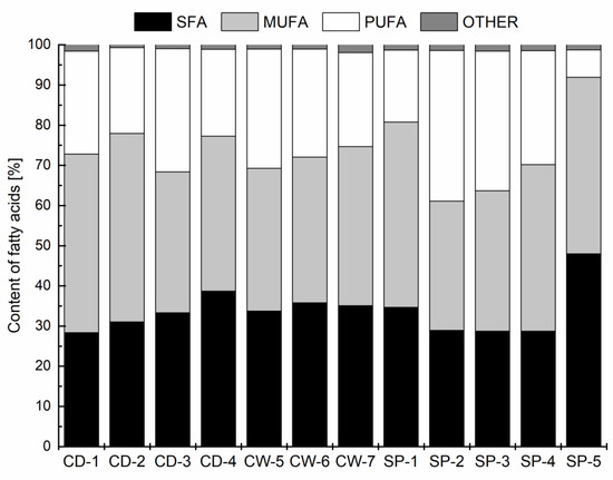 The percentages of saturated fatty acids (SFA), monounsaturated fatty acids (MUFA) and polyunsaturated fatty acids (PUFA) in total FA for all foods are presented in Figure 1. In the fraction of SFA, palmitic and stearic acids have the highest percentage for all foods. In turn, oleic acid has the most significant share in the MUFA fraction and linoleic acid has the highest percentage among PUFA in all foods.