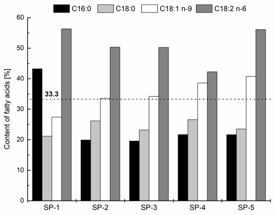 The obtained results for LA and ALA are consistent with the literature data, suggesting that LA is found mostly in vegetable oils and only in some animal fats (e.g., chicken fat); beef is not a rich source of omega-6 fatty acids [36,37,38]. Moreover, very high contents of oleic acid as well as high contents of palmitic and stearic acids in SP-1 and SP-5 are associated with high amounts of these acids in beef [38].
