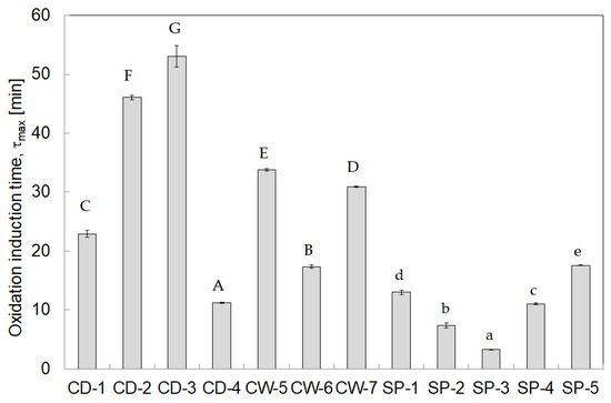 The oxidation induction time for each extracted fat, determined under isothermal conditions (at 100 °C), is presented in Figure 3. The longest τmax, thus the highest oxidative stability, was revealed for CD-2 and CD-3 (46.05 and 53.59 min, respectively) and the shortest τmax for SP-2 and SP-3 (7.14 and 3.32 min, respectively).