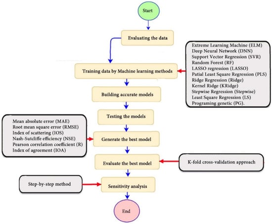 - Modeling the chosen inputs by means of numerous machine-learning methods. The ELM, DNN, SVR, RF, LASSO, PLS, Ridge, K Ridge, Stepwise, and GP methods have been employed in this step for suggesting 11 models.