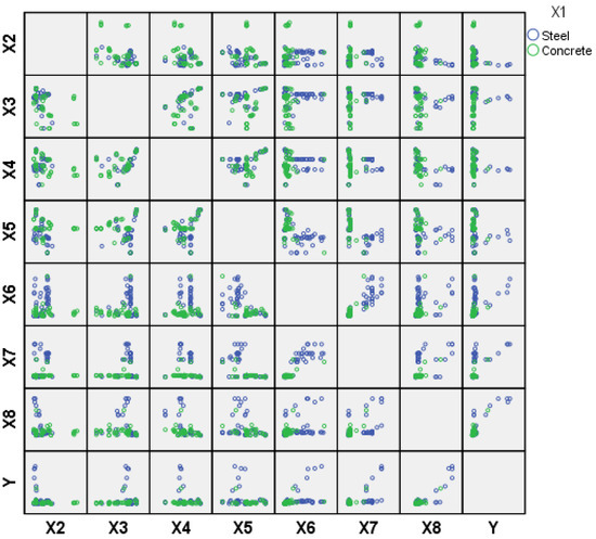 To statistically estimate the relationship between the pile-bearing capacity and input parameters, SPSS software has been utilized. The correlation matrix between them is displayed in Figure 2, which shows a descriptive summary of the data distribution. The findings show a positive correlation between the pile-bearing capacity and other inputs, except for X2, X4, and X5, which appear to have a negative correlation (see Figure 2). This highlights that the decrease in these parameters tends to proportionally decrease the pile-bearing capacity. Moreover, Pearson correlation coefficient (R) and its significance between the pile-bearing capacity and other inputs is presented in Table 5. The findings prove that the significance is less than 0.05, except for X3, X4, and X5, showing that most correlations are statistically significant. Hence, according to Smith’s classification (1986) [43], the pile-bearing capacity is significantly correlated with the input parameters, excluding X3, X4, and X5, which are poorly correlated. The results point out that these factors can have a complex nonlinear relationship with the pile-bearing capacity. Besides, in order to precisely model this complex phenomenon, new sophisticated machine-learning approaches should be developed.