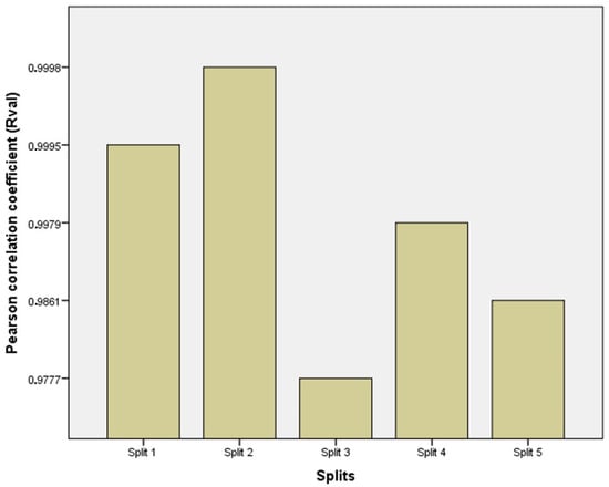 The 5-fold cross-validation approach was effectively utilized to evaluate the predictive capability of the optimal model. It is worthy to note that the aforementioned studies interested in predicting the pile-bearing capacity have assessed the predictive capability of their optimal models based on one single split. Consequently, the ability of the models to overcome the over-fitting and under-fitting problems could not be verified. Figure 3 displays the performance measures of the optimal DNN models utilizing 5-fold cross-validation based on the validation data for each split. The results clearly indicate the fulfillment of the DNN model. Additionally, the fact that the correlation coefficient ranged between 0.9777 and 0.9998 for data validation in the 5 splits proved the predictive capability of the optimal DNN model to learn existing data, generate novel validation data, and overcome over-fitting and under-fitting problems.