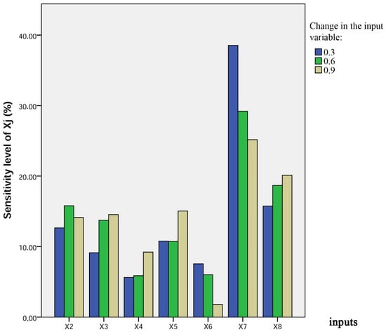 In order to know what input variables have a significant effect on the pile-bearing capacity, with the assistance of the DNN model, a sensitivity analysis was performed by utilizing the step-by-step technique [60]. In this method, each normalized input parameter varies at a constant rate, one at a time, while the other variables are held constant. Diverse constant rates (0.3, 0.6, and 0.9) were chosen in this study. For every input, the percentage of variation in the output, as a result of the variation in the input, was computed. The sensitivity of each input was computed based on Equation (7):