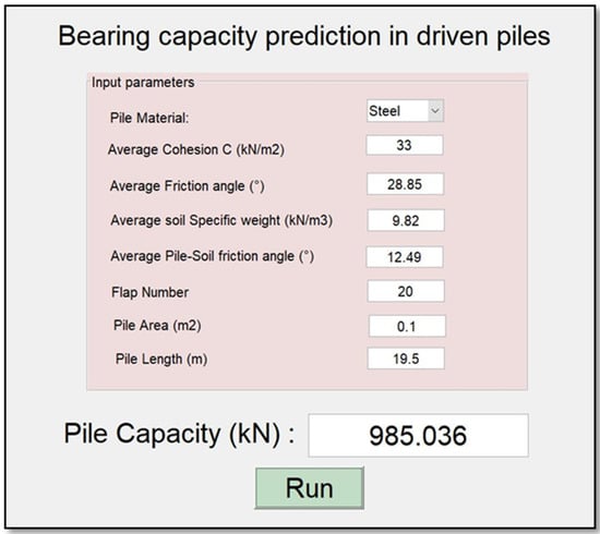 It is a common practice in the majority of published papers using machine-learning modeling to present models in the form of mathematical equations, which suffer from their hard fitting in future studies. Seemingly, this practice has very little value for other researchers and civil engineers in the field. In order to make it useful, the proposed machine-learning architecture should be presented either in the form of a programmed interface such as Matlab or in a simple script employing a known programming language such as Python for generating the proposed model [55]. In such a case, the machine-learning model can be readily used and is thus available to anyone interested in the problem of modeling. In this study, a reliable, graphical, and easy-to-use interface was designed based on our optimal DNN model, as presented in Figure 5. The proposed optimal model was afterward used to develop a GUI public interface. The designed interface, called “BeaCa2021”, was programmed by Matlab software. The reason for choosing this name is due to “Bea” relative to “Bearing”, “Ca” relative to Capacity, and 2021, the year this interface was designed. In addition, BeaCa2021 includes the most relevant input parameters on the bearing capacity. Initially, the user must define the pile material type (either steel or concrete). Secondly, the user is required to introduce the other input parameters: average cohesion, average friction angle, average soil-specific weight, average pile-soil friction angle, flap number, pile area, and pile length. Finally, by clicking Run, the prediction result appears in the outputs. The suggested BeaCa2021 interface will be very useful to civil engineers and researchers, by helping them to predict the bearing capacity, which is deemed as one of the most complex parameters to determine.