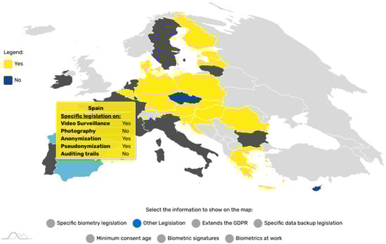 The results of the survey have also been integrated into a dynamic map, enabling quick navigation through the different topics of information and comparison of the EU member states at a glance. The map has been published and can be found at []. The published map is depicted in Figure 1. The figure also shows what specific additional legislation is present in Spain, but naturally, users can hover over any of the countries covered in the survey to get its information.